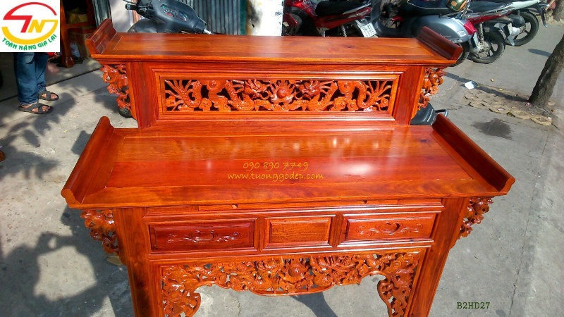 Bàn thờ nhị cấp, tầng 1 rộng 48cm x ngang 1.27m x cao 1.08m - Tầng 2 rộng 30cm x ngang 1.27m x cao 1.34m