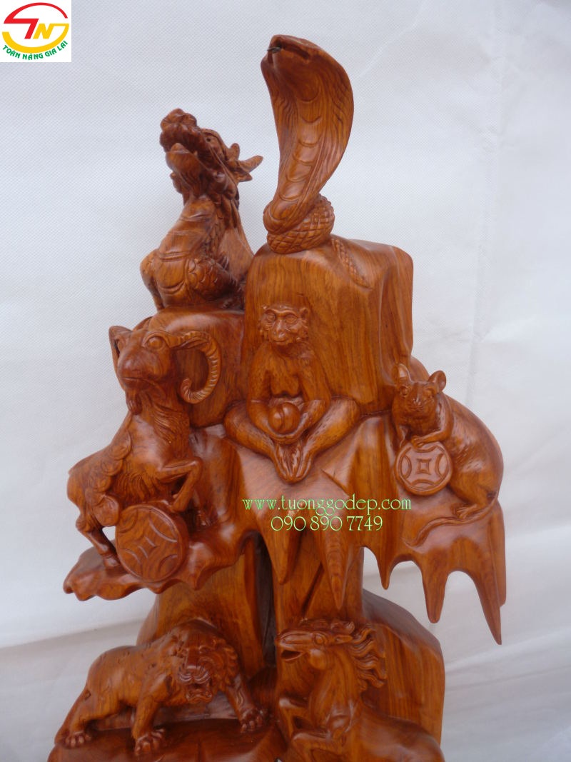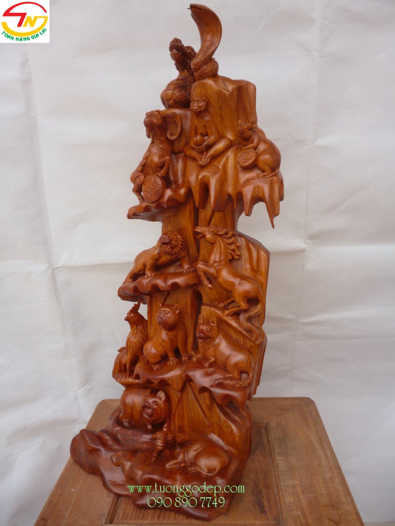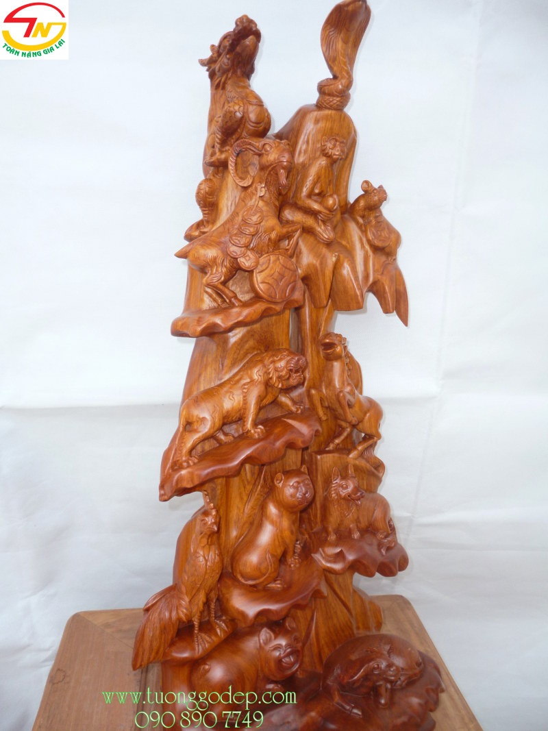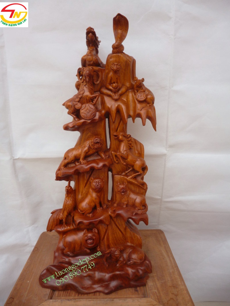 Cây 12 Con giáp bằng gỗ hương (cao 68cm x rộng 28cm). Nhận tạc con giáp theo thứ tự trong nhà ba, mẹ, con...