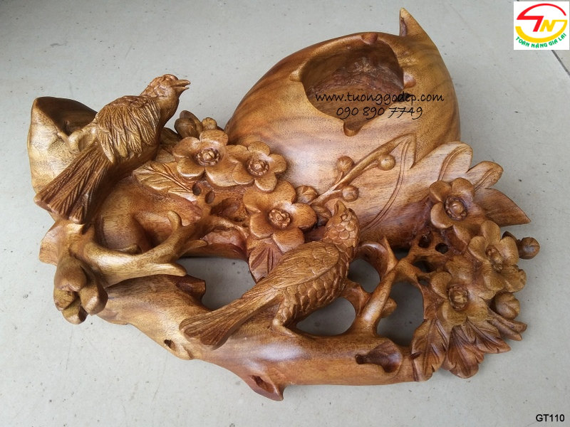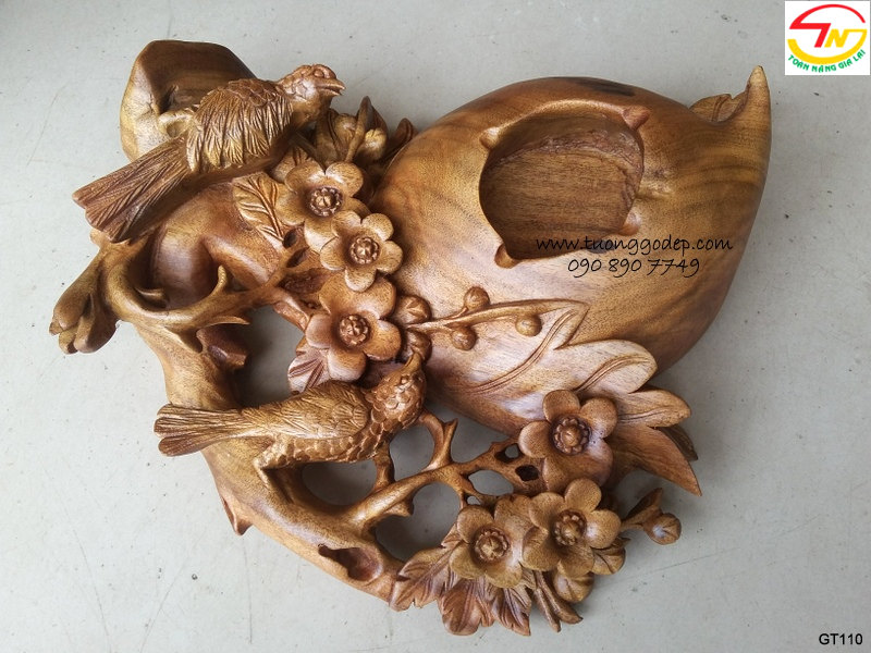 Những người nghệ nhân làng nghề mộc truyền thống ở Gia Lai đã khéo léo dựa vào dáng gỗ, thế gỗ tự nhiên để tạc thành hình trái đào với đôi chim đậu trên cành mai điểu uyển chuyển sống động như thật. Toàn bộ bộ gạt tàn gỗ xá xị tỏa ra mùi hương nhẹ nhàng dễ chịu của núi rừng vừa có tác dụng thanh lọc không khí, loại bỏ mùi hôi của tàn thuốc lại vừa giúp phục hồi năng lượng, giảm tải căng thẳng stress.