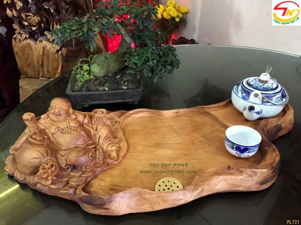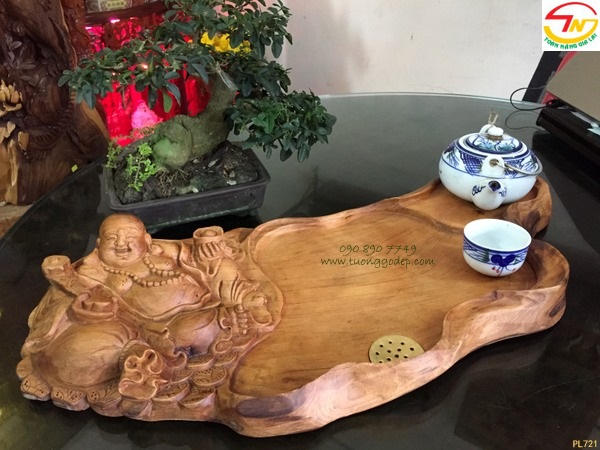 Khay trà kết hợp với Phật Di Lặc ngồi cầm như ý và bát vàng...