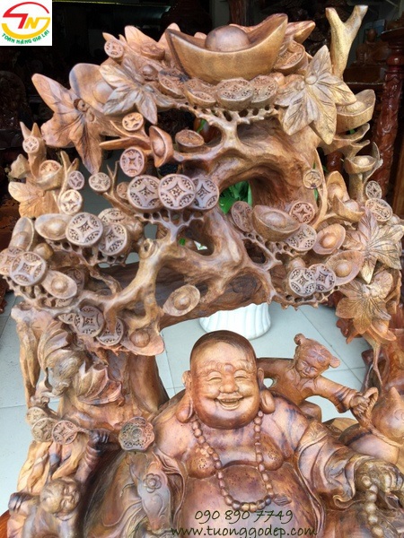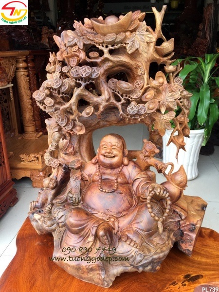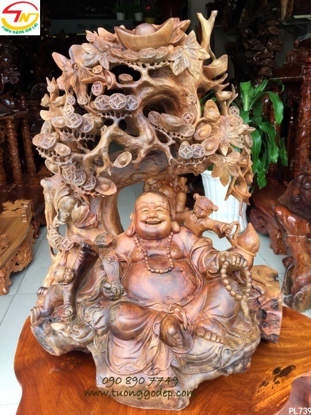 Ý nghĩa: Tượng Phật Di Lặc gỗ nu xá xị. Tay cầm như ý và tràng hạt, ngồi dưới cây tài lộc. Kết hợp với nhị phúc
