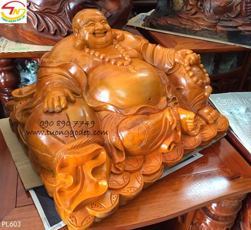 Phật Di Lặc bằng gỗ mít. ngang 50cm x sâu 48cm x cao 30cm
