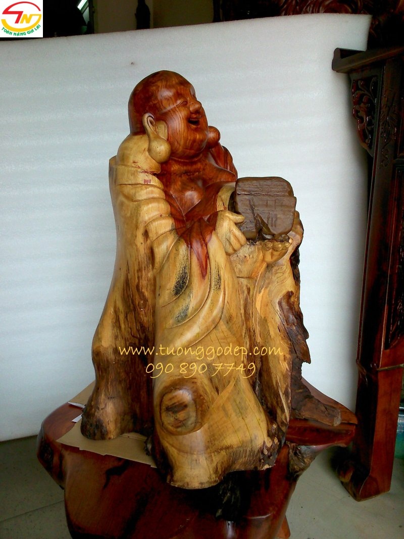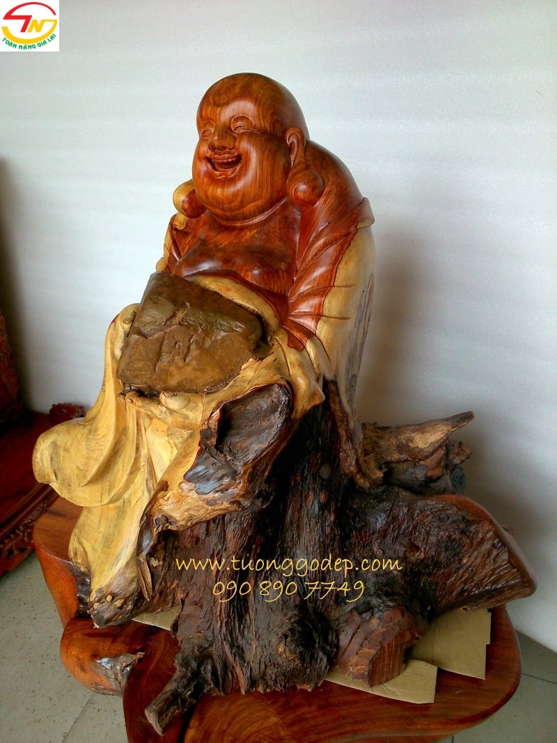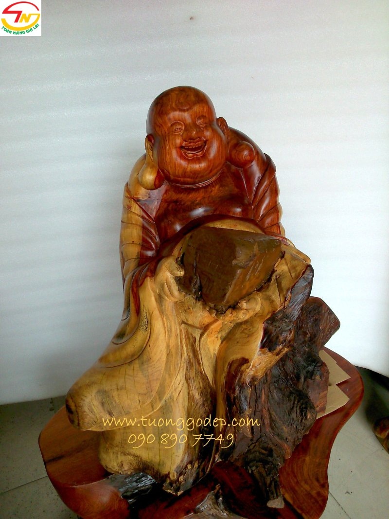 Tượng gỗ Phật Di Lặc ôm đá (Gỗ hương ôm đá tự nhiên, cao 58cm x rộng 58cm x sâu 38)