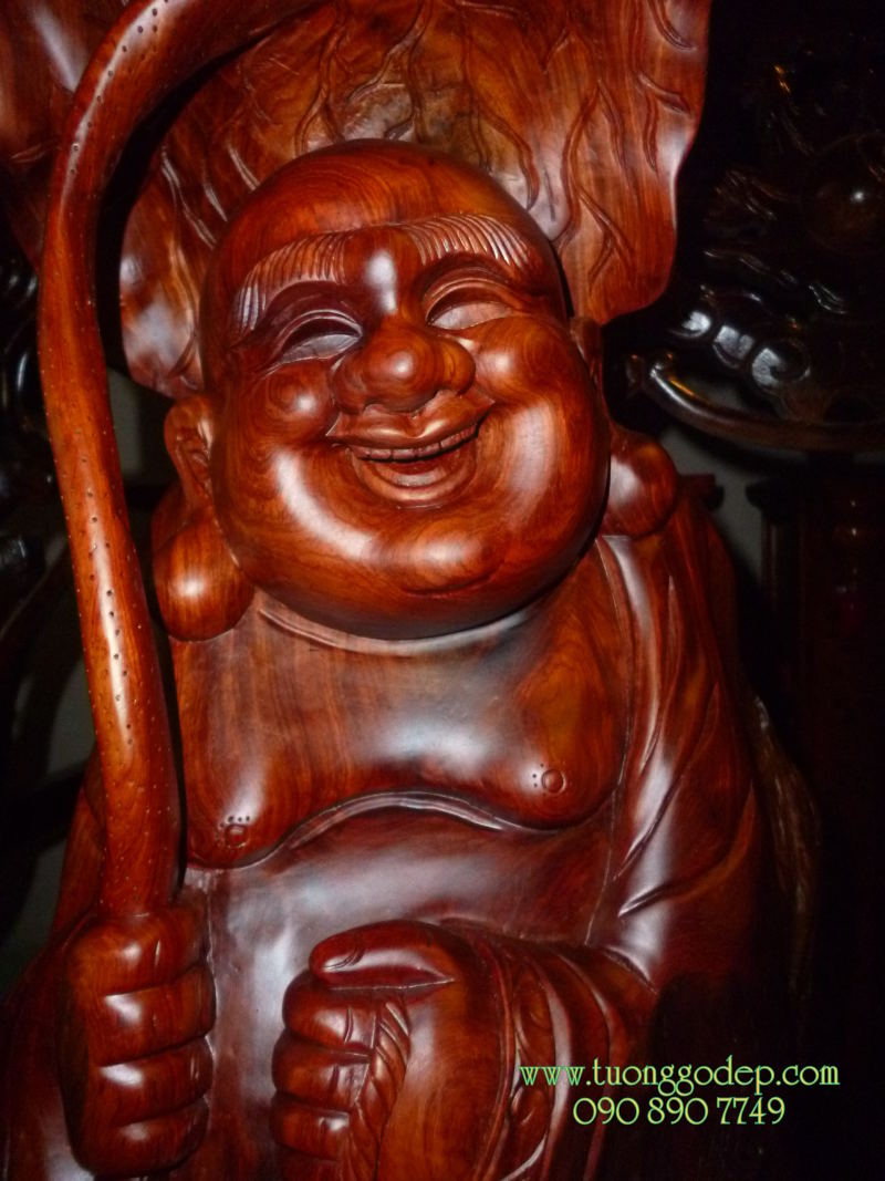 Tượng thế Phật Di Lặc đội lá sen mang dây tiền, Gỗ hương vân cực đẹp- Cao 85cm