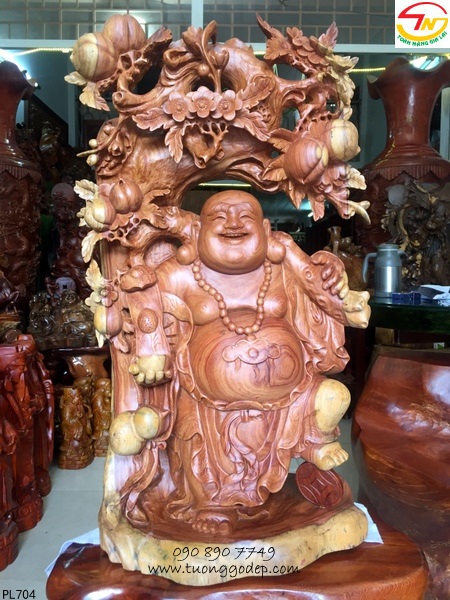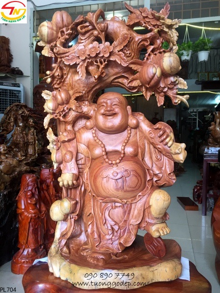 Ý nghĩa: Tượng Phật Di Lặc tay như ý . Tượng Di lặc đứng cây đào. Cây đào biểu tượng cho sự đổi mới và sức sinh sôi phát triển - Cây Đào trong phong thuỷ được xem là tinh hoa của Ngũ Hành. Đào có thể trị bách quỷ, xua đuồi tà ma.