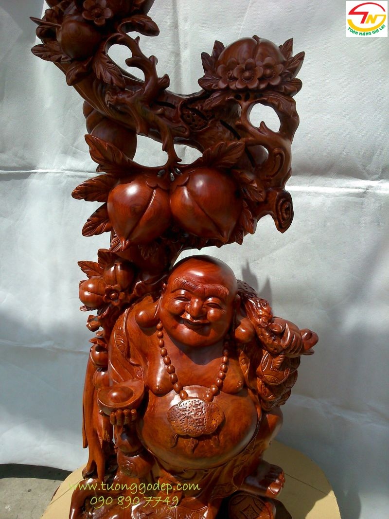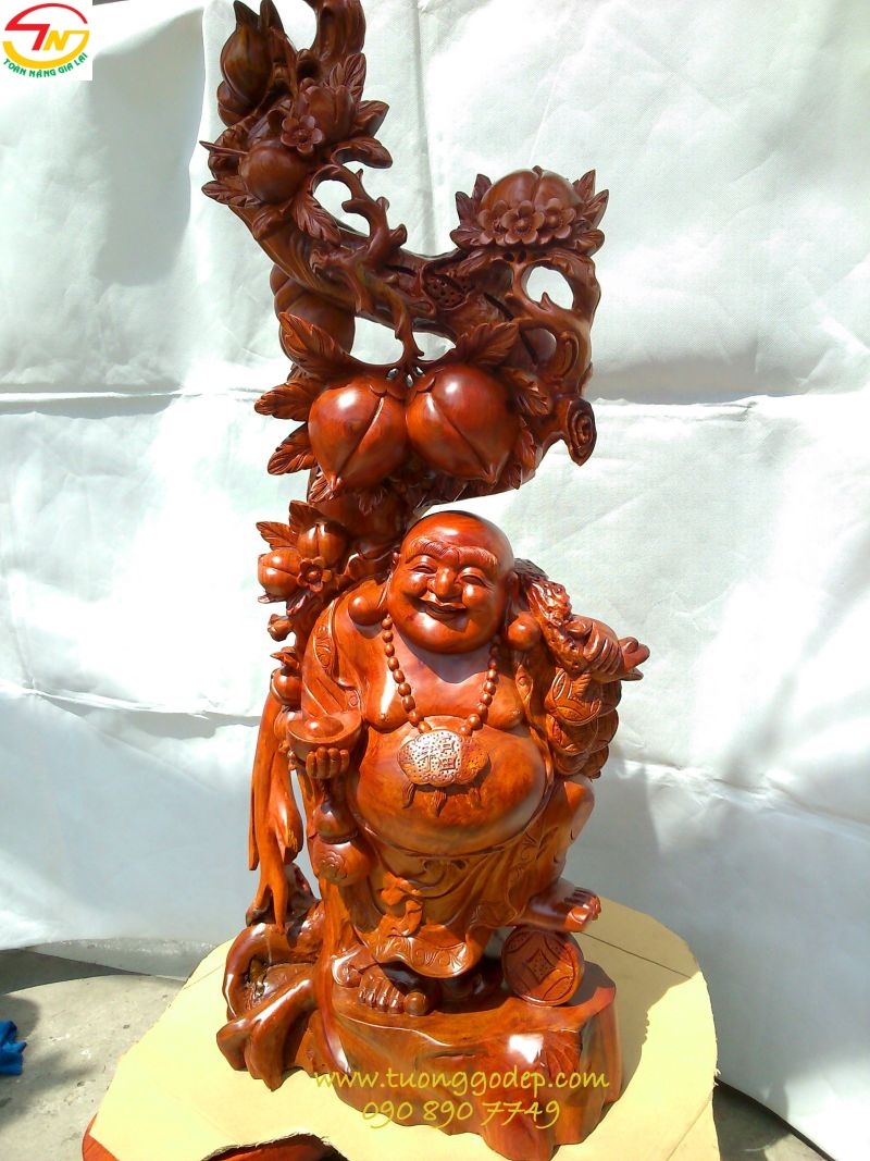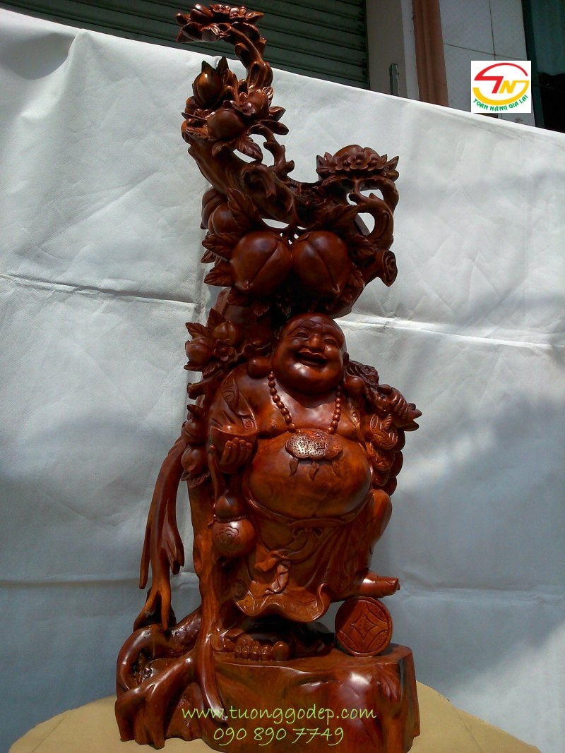Tượng Phật Di Lặc bằng gỗ hương đứng gốc đào (Cao 1.17m x rộng 42cm)