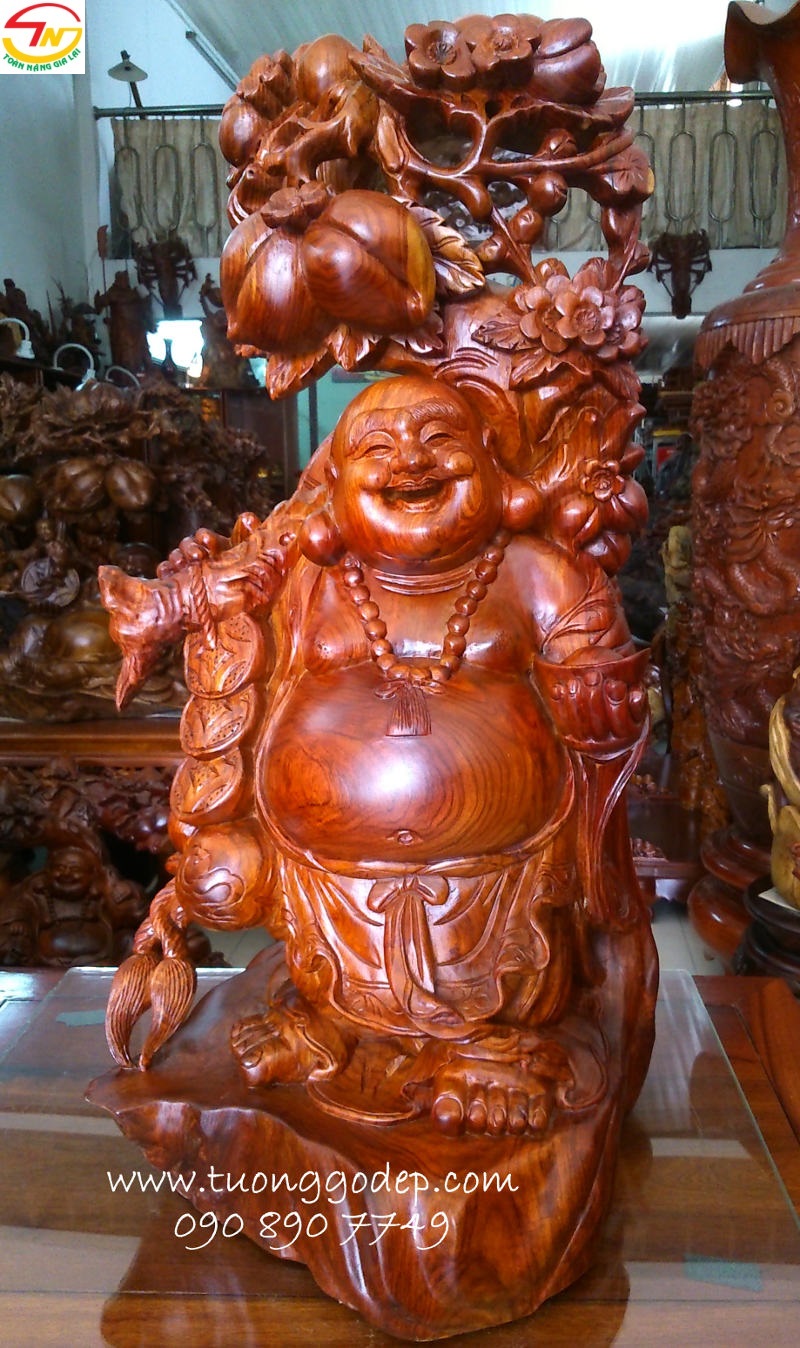 Tượng Phật Di Lặc bằng gỗ hương đứng gốc đào, cao 58cm