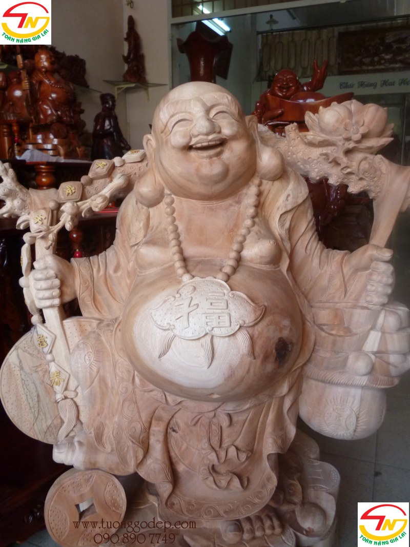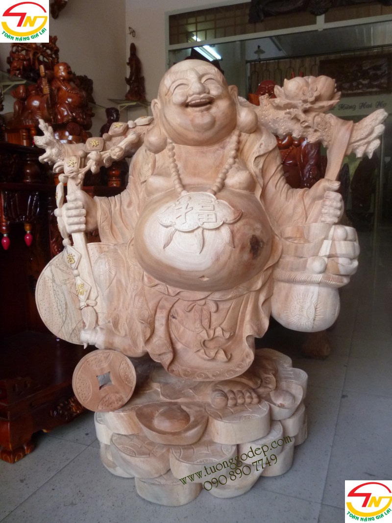 Phật Di Lặc gánh tiền gỗ xà cừ, cao 1m x ngang 86cm x sâu 60cm,