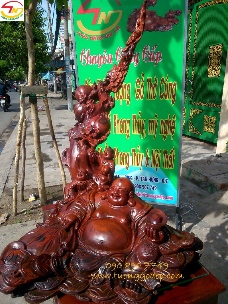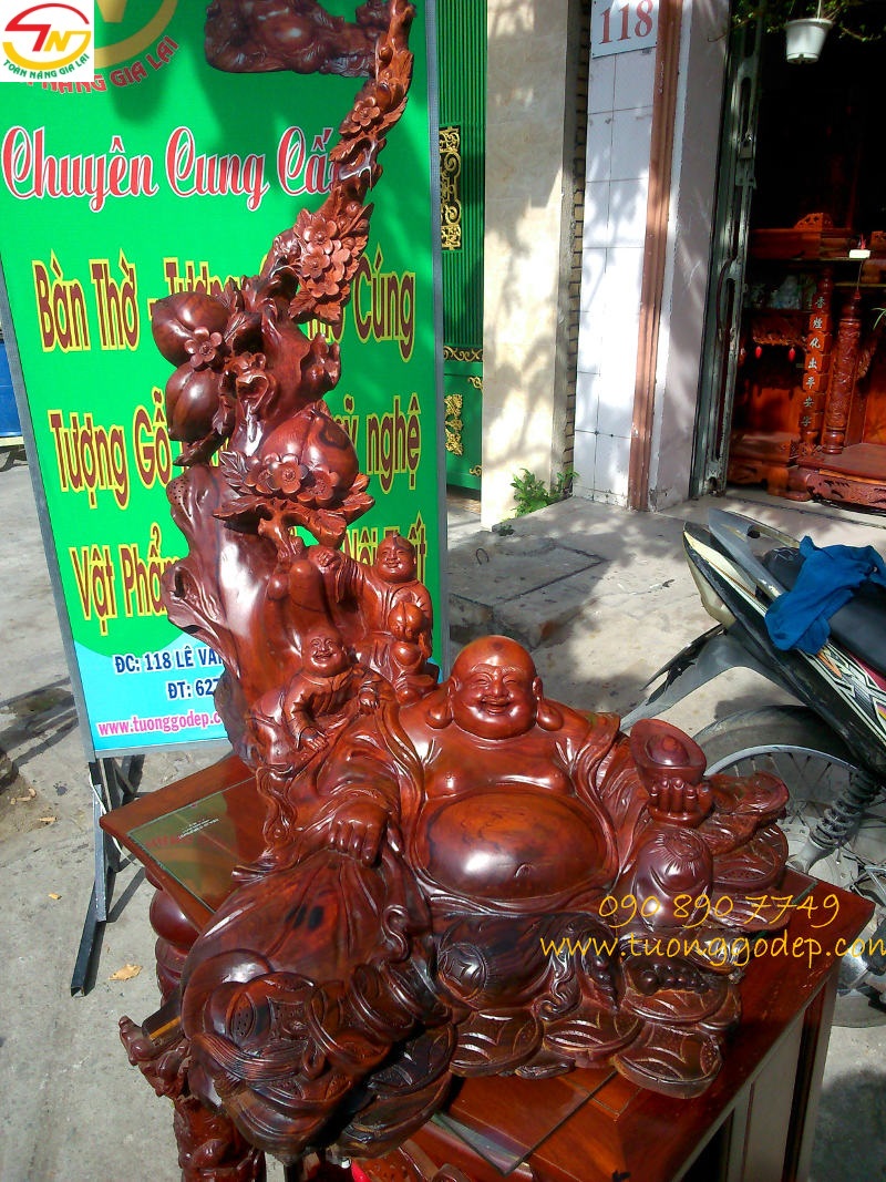 Phật Di Lặc ngồi gốc đào gỗ cẩm, cao 73cm x rộng 56cm x dài 48cm)