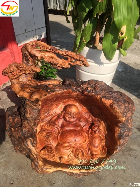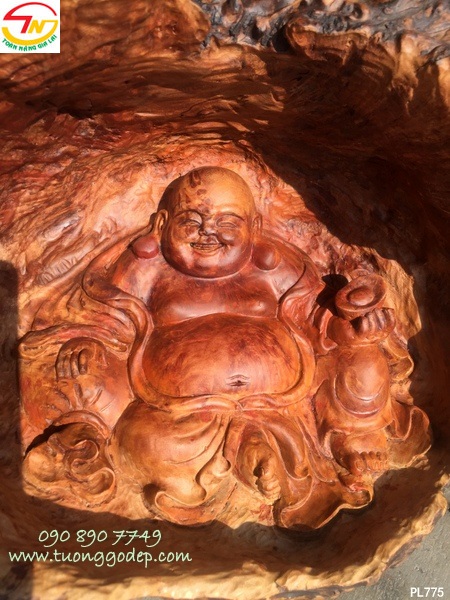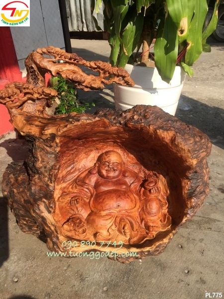Ý nghĩa: Tượng Phật Di Lặc gỗ nu. Tay cầm bát vàng và túi càn khôn, ngồi dưới tán cây tùng, cây tùng mang ý nghĩa cát tường...