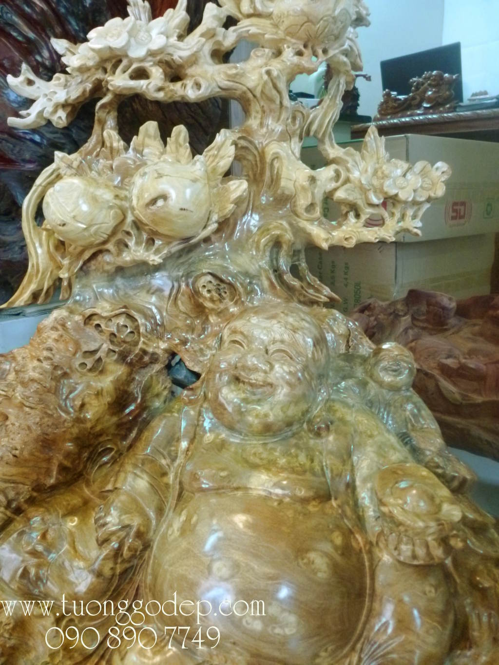 Tượng gỗ Phật Di Lặc ngồi gốc đào (Gỗ nu nghiến - Cao 81cm)
