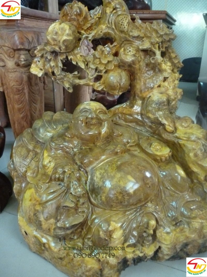 Tượng gỗ Phật Di Lặc ngồi gốc đào (Gỗ nu nghiến - Cao 62cm x ngang 68cm)