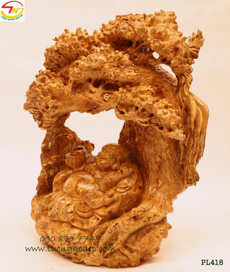 Tượng Phật Di Lặc ngồi gốc tùng gỗ nu nghiến - rộng 48cm x cao 48cm