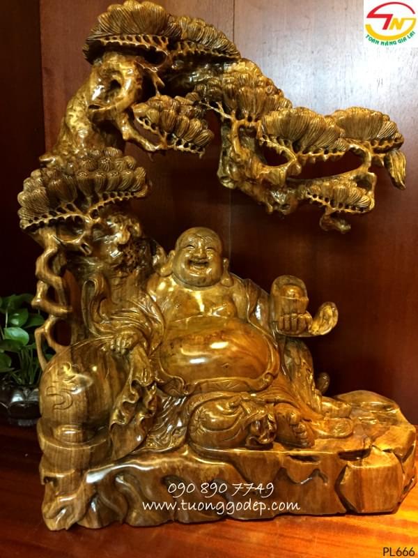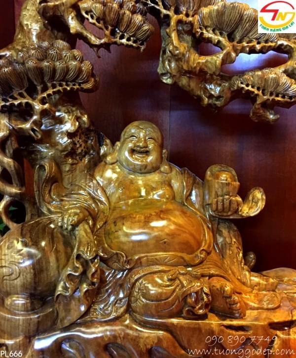 Ý nghĩa: Tượng Phật Di Lặc gỗ nu xá xị. Tay cầm bát vàng và túi càn khôn, ngồi dưới tán cây tùng, cây tùng mang ý nghĩa cát tường...