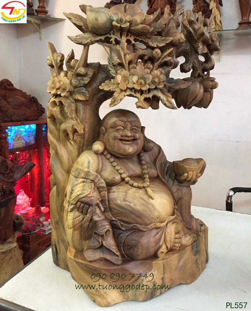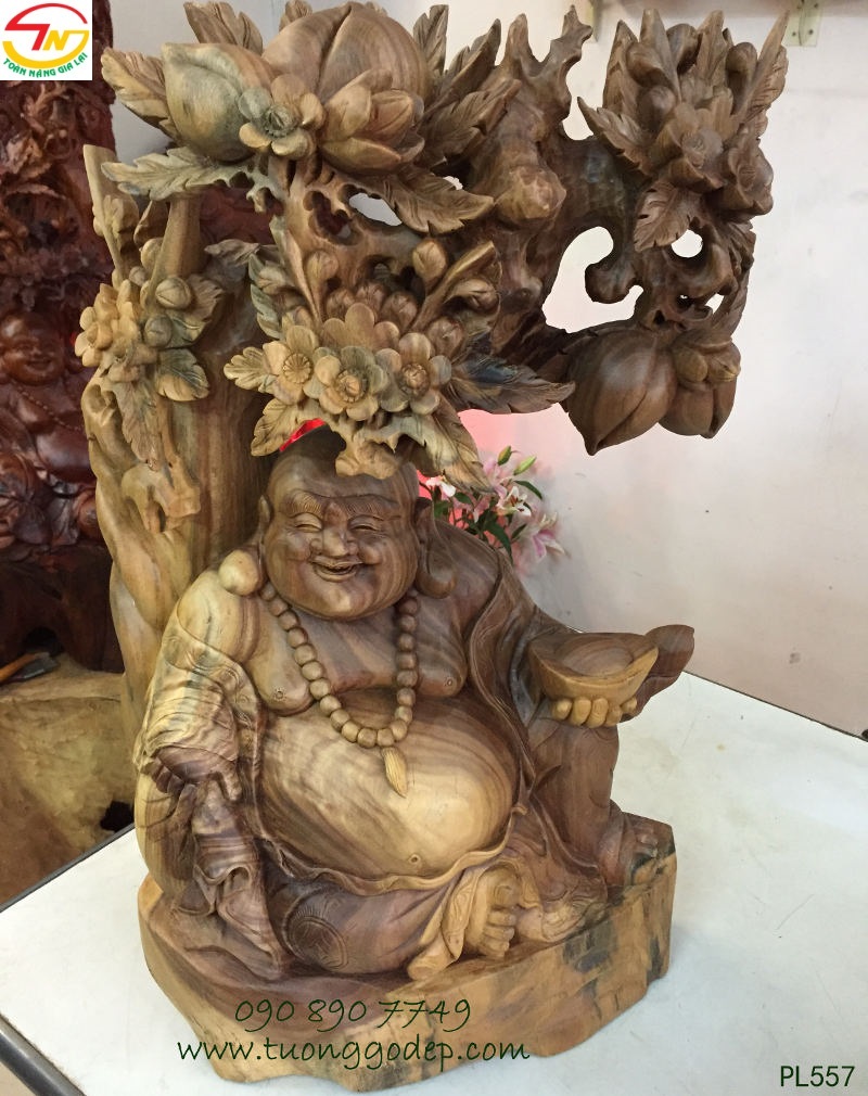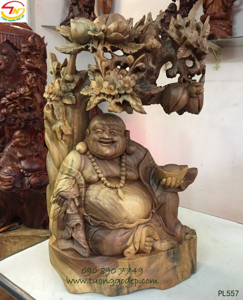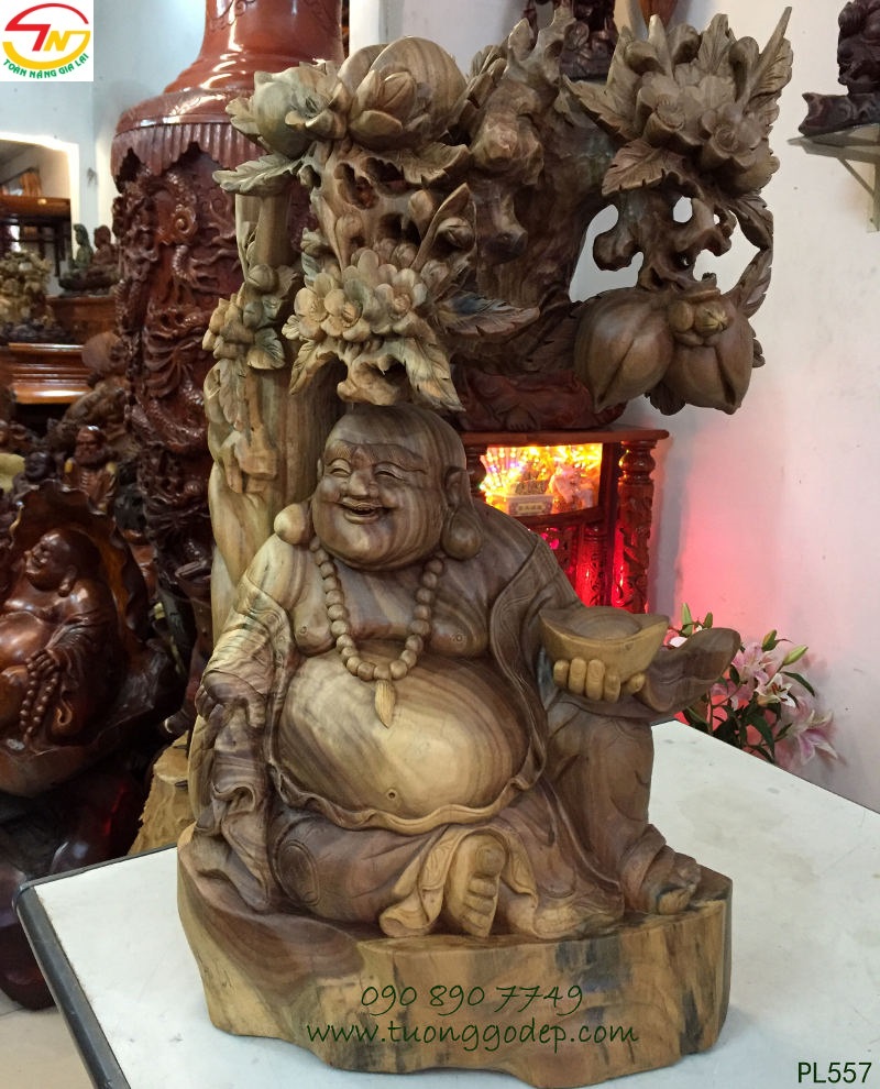 Tượng gỗ Phật Di Lặc ngồi gốc đào (cao 60cm x ngang 38cm, gỗ bách xanh hay còn gọi gỗ đổi màu) do nghệ nhân tạc tinh xảo làm bằng gỗ quý, gỗ đổi màu gỗ này có khả năng đổi màu theo ánh sáng và nhiệt độ. Ban đầu gỗ có màu trắng xám nhạt, nhưng để lâu sẽ chuyển dần sang màu xanh bích đậm với vẻ ngoài bóng đẹp như đá, như sừng, nhưng vẫn nổi rõ đường vân với hoa văn đẹp như thủy tùng.