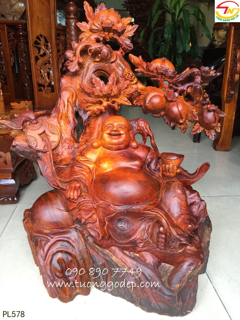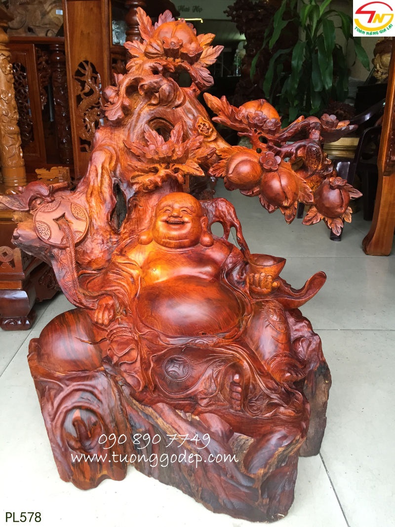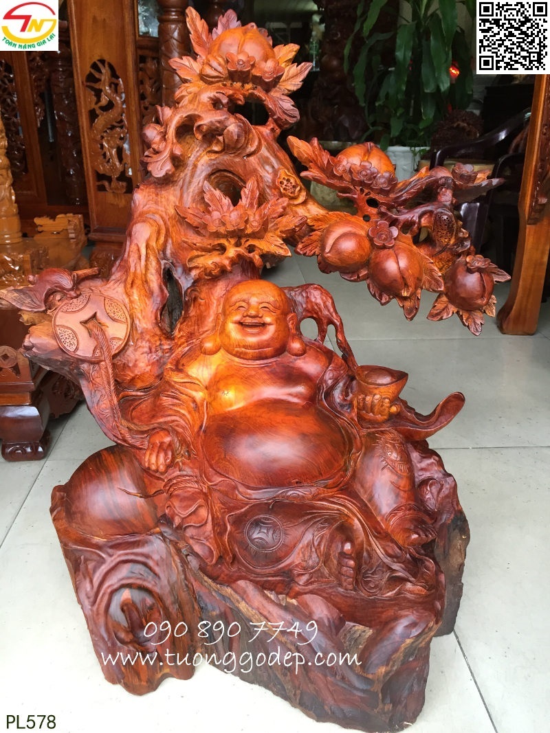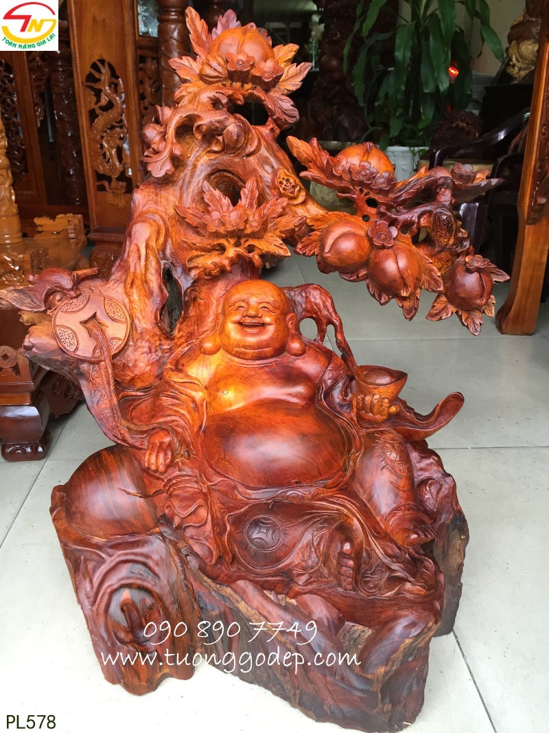 Ý nghĩa: Phật Di Lặc tay cầm bát vàng và túi càn khôn mang ý nghĩa tài lộc kết hợp với cây đào. Cây đào biểu tượng cho sự đổi mới và sức sinh sôi phát triển - Cây Đào trong phong thuỷ được xem là tinh hoa của Ngũ Hành. Đào có thể trị bách quỷ, xua đuồi tà ma...Phía sau tượng được tạc con dơi ngậm dây tiền. Trong phong thủy con dơi là linh vật biểu tượng sự may mắn, an lành. Con dơi có âm Hán – Việt là phúc, đọc trùng âm với chữ phúc trong từ hạnh phúc, sung sướng. Vì thế người ta đã lấy con vật này để chỉ niềm hạnh phúc sung sướng, cầu mong hạnh phúc đến với mọi người. Hình ảnh con dơi đang bay, miệng ngậm đồng tiền lớn, hay hình ảnh con dơi ngậm chiếc khánh đá, con dơi ngậm chữ thọ, con dơi ngậm hoa cúc… được các nghệ nhân khắc hoặc đắp nổi có lẽ đều mang ý nghĩa nhất định.