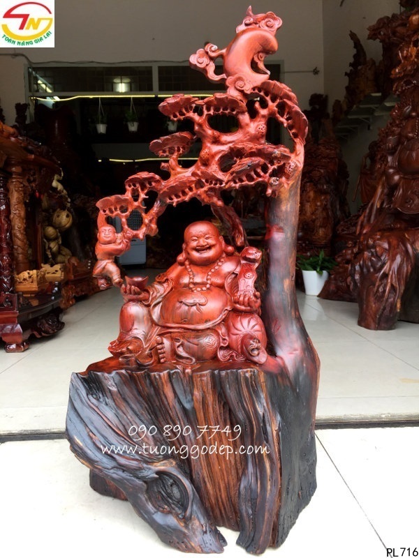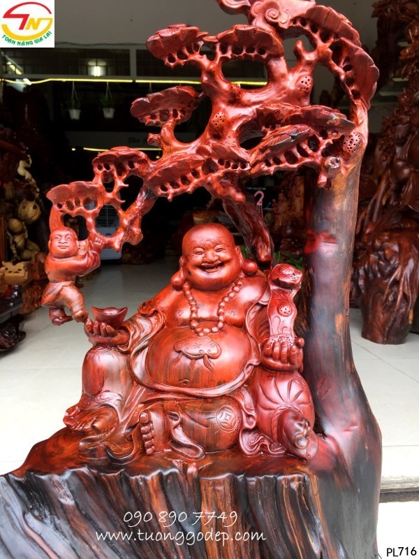 Ý nghĩa: Phật Di Lặc ngồi cây tùng mang đến sự cát tường, vạn sự như ý cho gia chủ.., Kết hợp đồng tử, và bát vàng mang đến sức khoẻ và tài lộc...