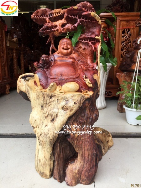 Tượng Phật Di Lặc ngồi gốc tùng. Tay cầm bát vàng và túi càn khôn.