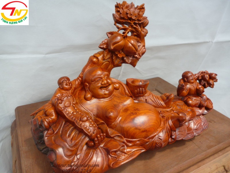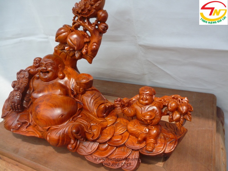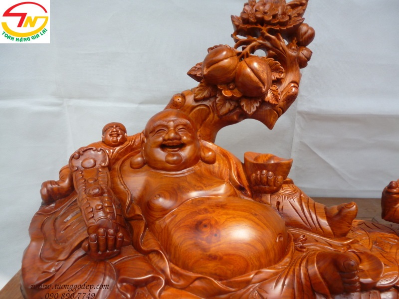 Tượng Phật Di Lặc ngồi trên bao & đế tiền tựa gốc đào, tay cầm như ý và vàng, với nhị phúc (nhất phúc Trường Thọ, nhị phúc Phú Quý).
