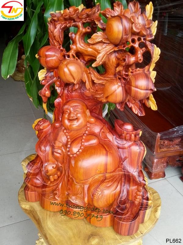 Tượng Phật Di Lặc tay cầm bát vàng ngồi cây đào tượng trưng cho tài lộc sinh sôi, tiền tài nở rộ như sự sống mạnh mẽ của cây đào.