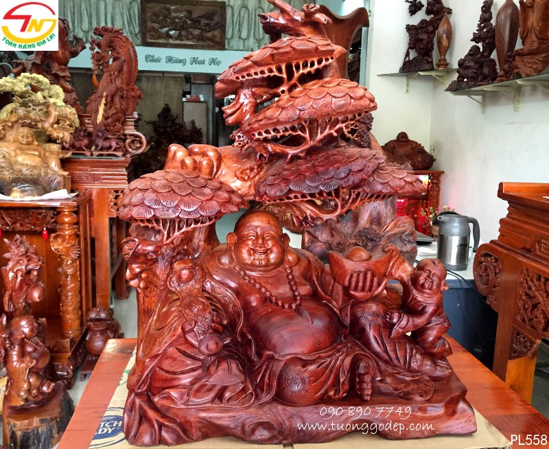Tượng Phật Di Lặc bằng gỗ hương ngồi gốc tùng (cao 48cm x rộng 42cm)