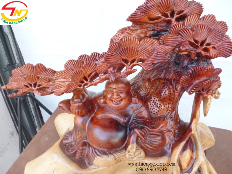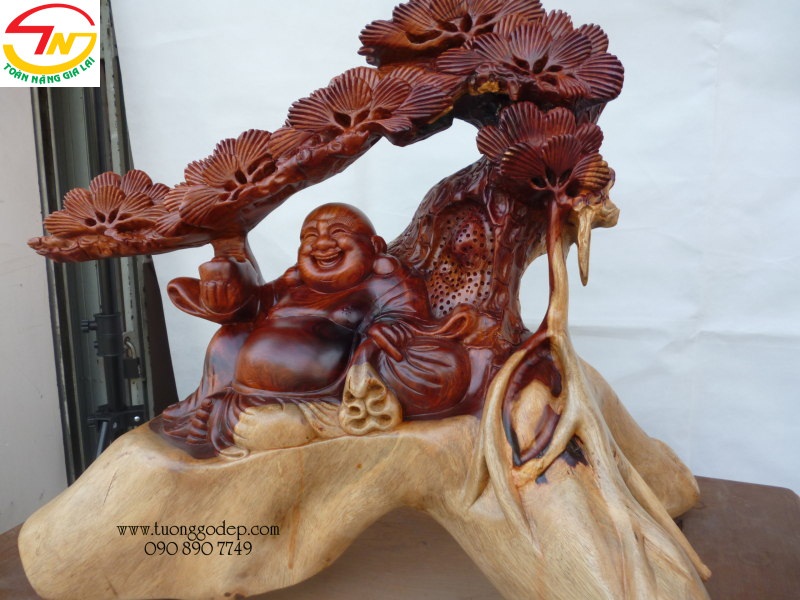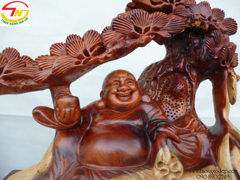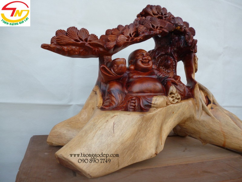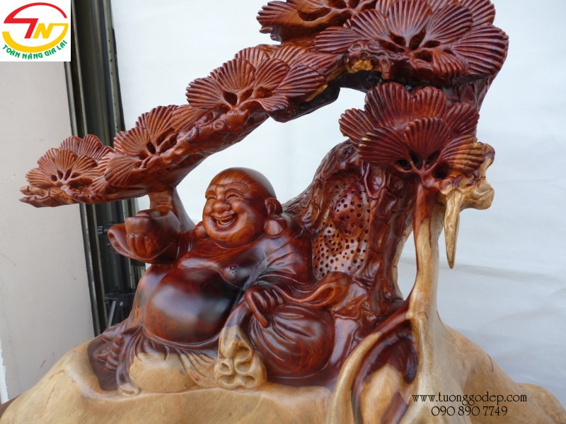 Tượng Phật Di Lặc bằng gỗ hương ngồi gốc tùng - Tuyệt tác!!! (cao 56cm x rộng 60cm x sâu 37cm)