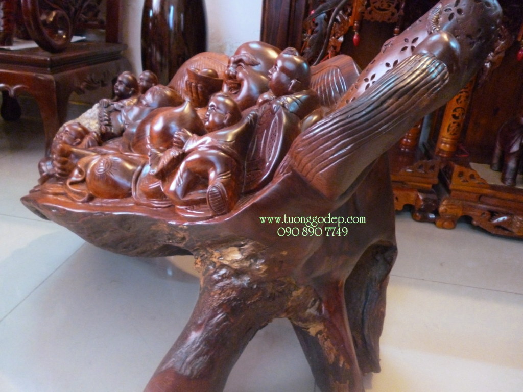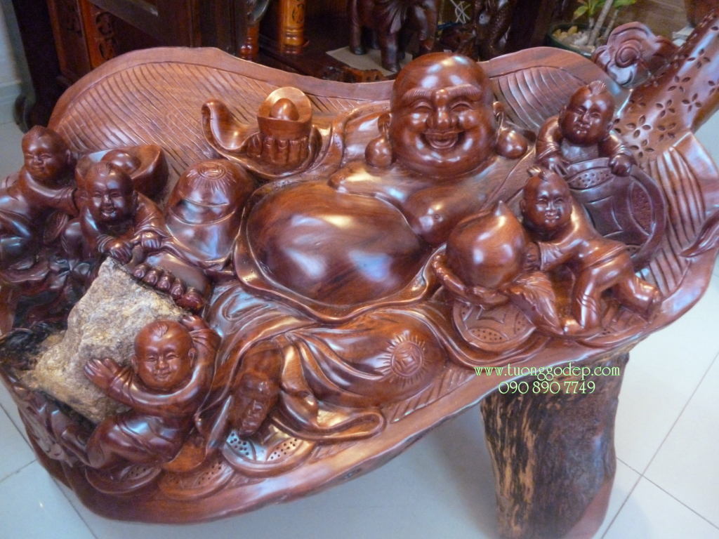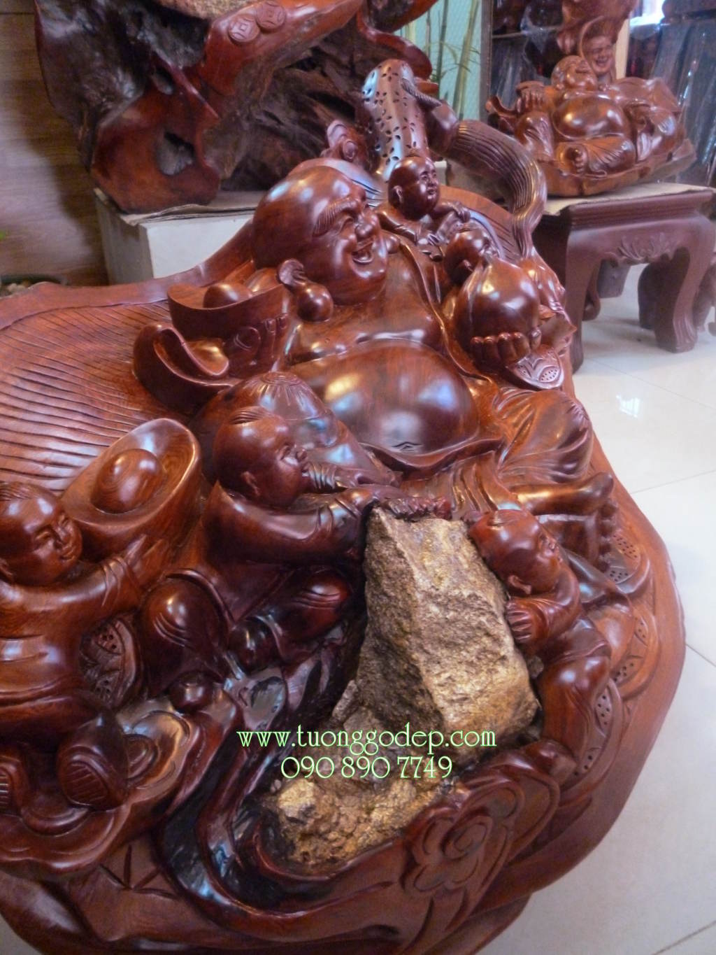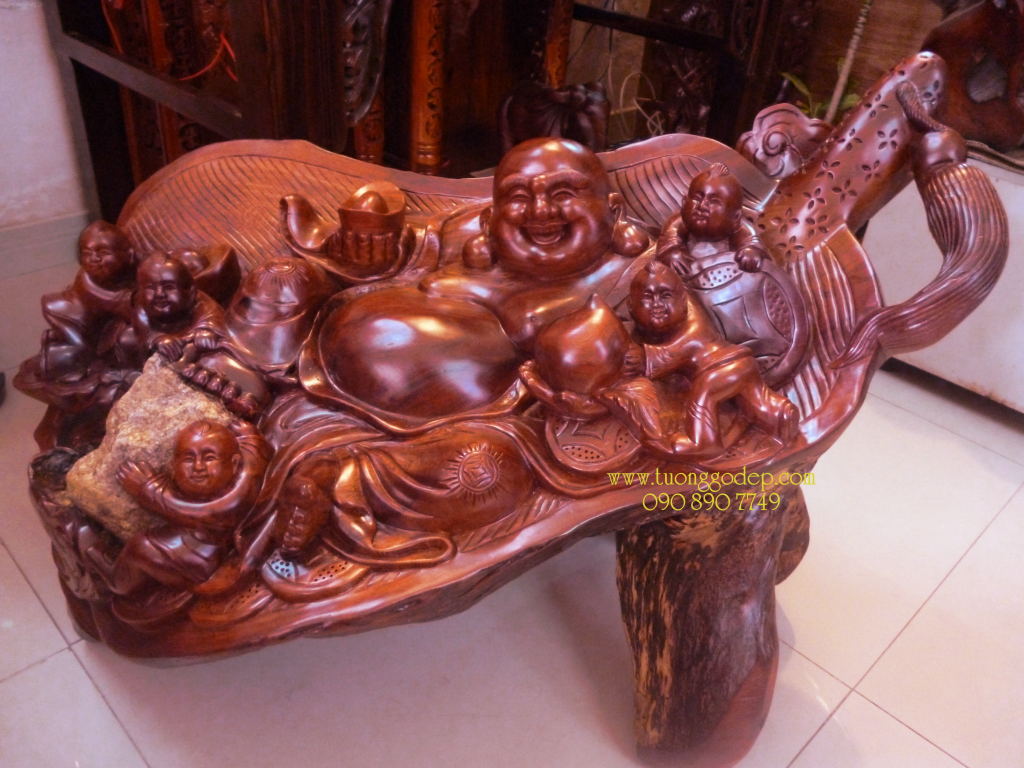 Tượng gỗ Phật Di Lặc ngũ tặc nằm trên quạt ba tiêu, Gỗ hương - Dài 89cm x Cao 62cm x sâu 50cm - Thế gỗ có đá