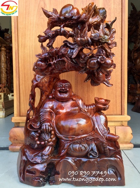 Ý nghĩa: Tượng Phật Di Lặc gỗ nu xá xị. Tay cầm bát vàng mang ý nghĩa tài lộc và cầm tràng hạt, ngồi dưới cây đào. Cây đào biểu tượng cho sự đổi mới và sức sinh sôi phát triển - Cây Đào trong phong thuỷ được xem là tinh hoa của Ngũ Hành. Đào có thể trị bách quỷ, xua đuồi tà ma.