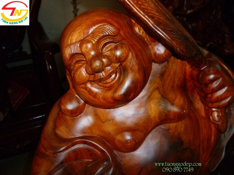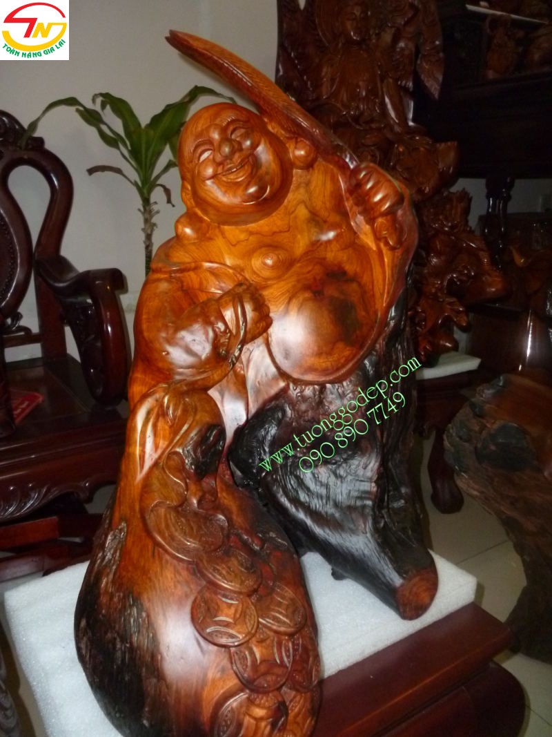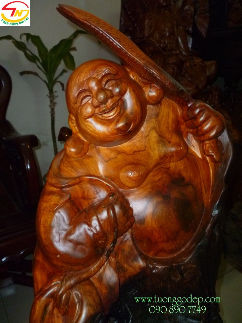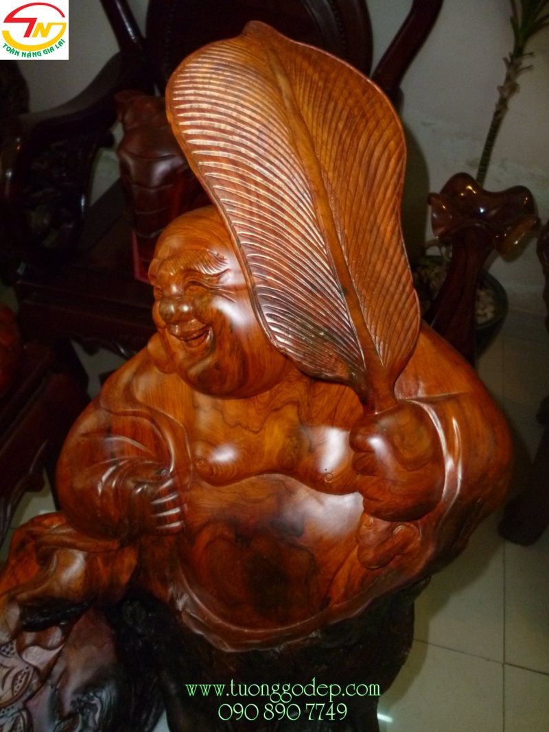 Phật Di Lặc Quạt Ba Tiêu & Dây tiền (Gỗ hương vân rất đẹp - Cao 62cm x sâu 42cm)