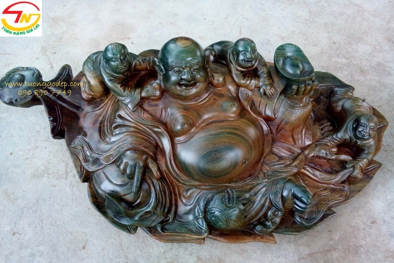 Tượng gỗ Phật Di Lặc tam phúc (gỗ bách xanh hay còn gọi gỗ đổi màu). Gỗ đổi màu gỗ này có khả năng đổi màu theo ánh sáng và nhiệt độ. Ban đầu gỗ có màu trắng xám nhạt, nhưng để lâu sẽ chuyển dần sang màu xanh bích đậm với vẻ ngoài bóng đẹp như đá, như sừng, nhưng vẫn nổi rõ đường vân với hoa văn đẹp như thủy tùng.
