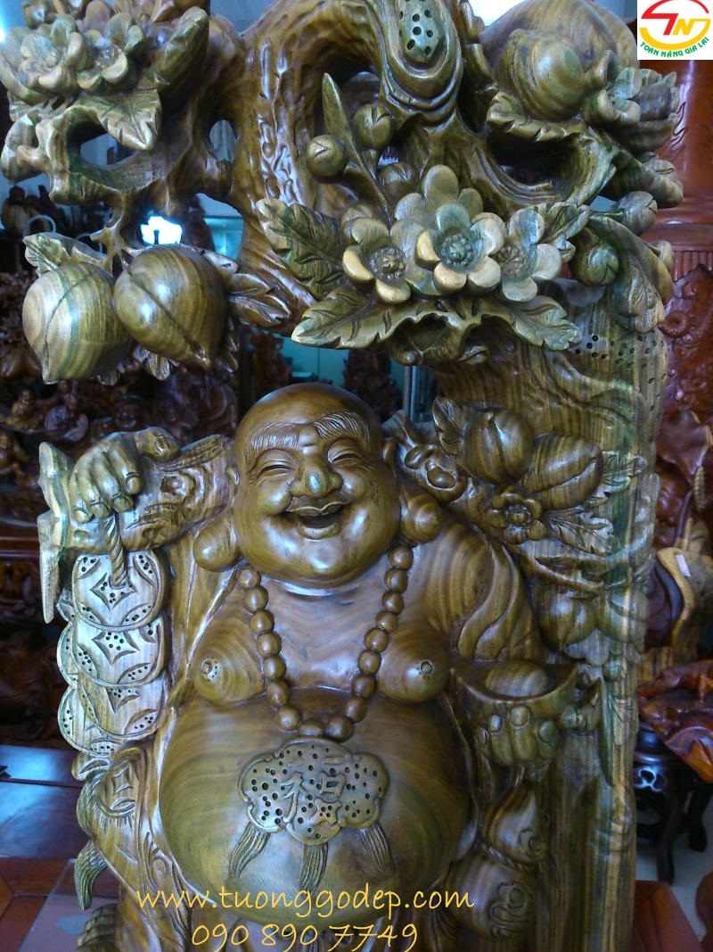 Tượng gỗ Phật Di Lặc đứng gốc đào (cao 62cm x ngang 37cm, gỗ bách xanh hay còn gọi gỗ đổi màu) do nghệ nhân tạc tinh xảo làm bằng gỗ quý, gỗ đổi màu gỗ này có khả năng đổi màu theo ánh sáng và nhiệt độ. Ban đầu gỗ có màu trắng xám nhạt, nhưng để lâu sẽ chuyển dần sang màu xanh bích đậm với vẻ ngoài bóng đẹp như đá, như sừng, nhưng vẫn nổi rõ đường vân với hoa văn đẹp như thủy tùng.