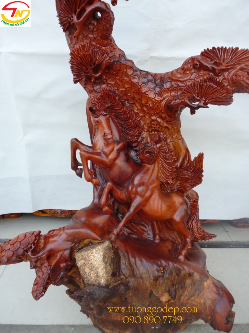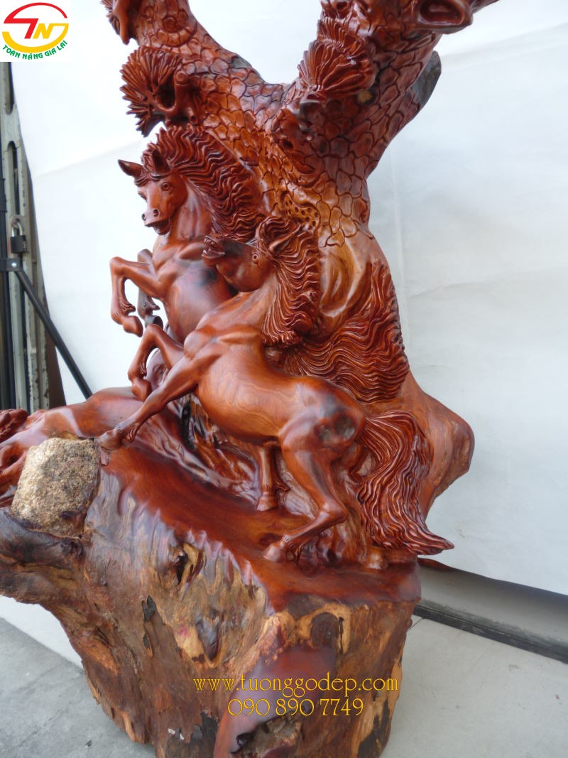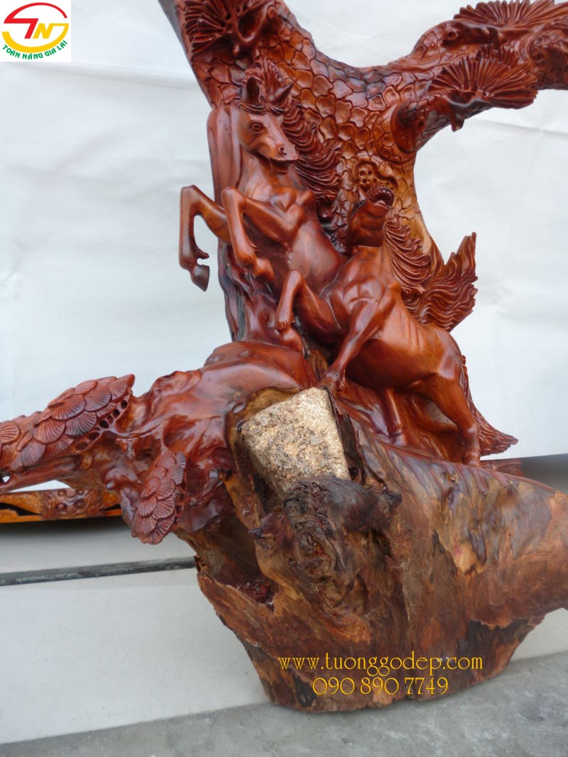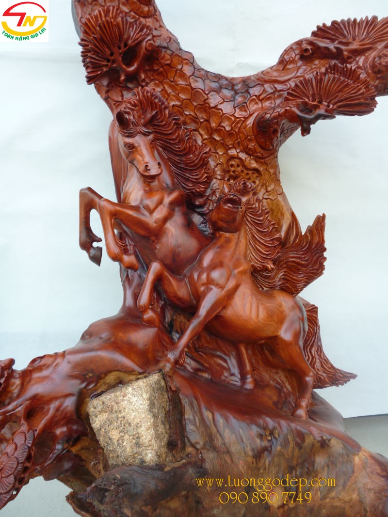 Tượng Song mã truy phong (Gỗ hương ôm đá tự nhiên, cao 1.08m x ngang 80cm)