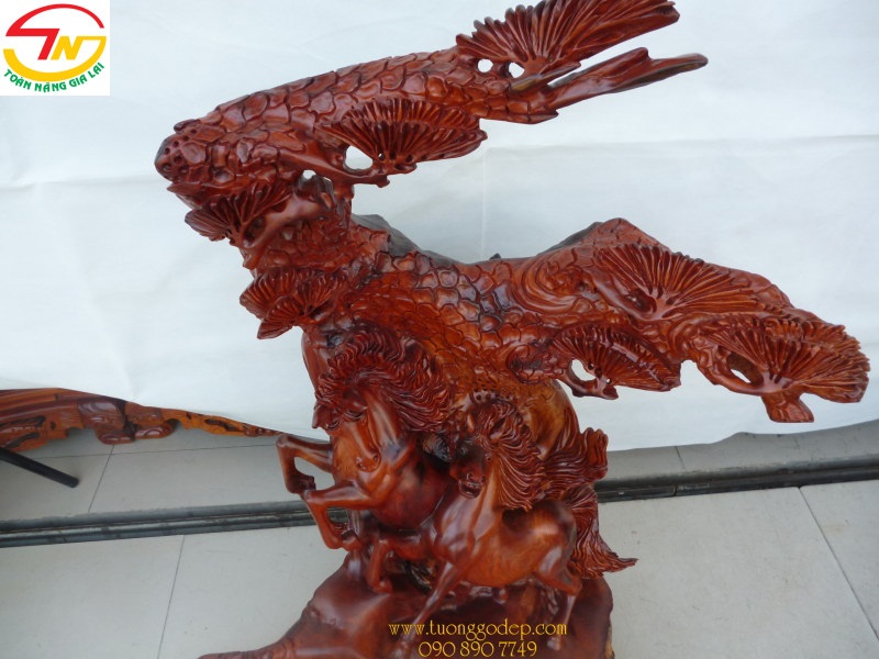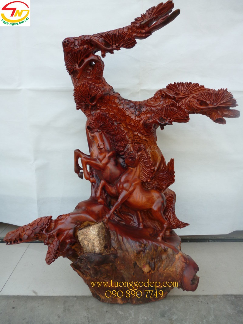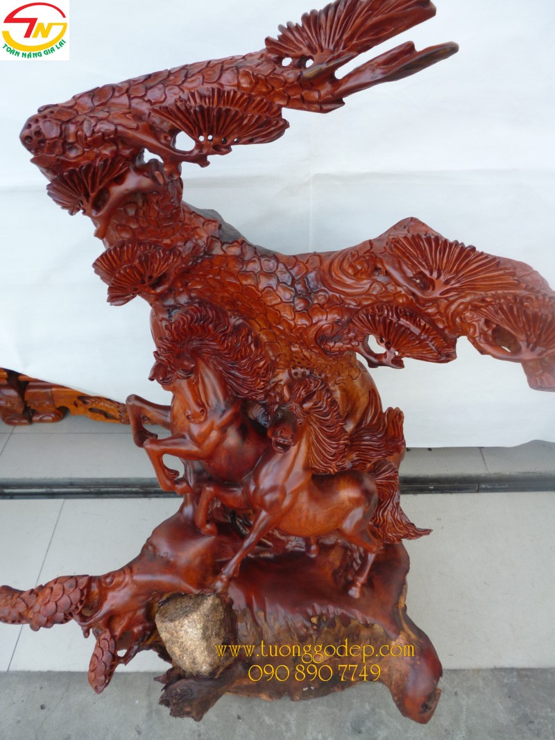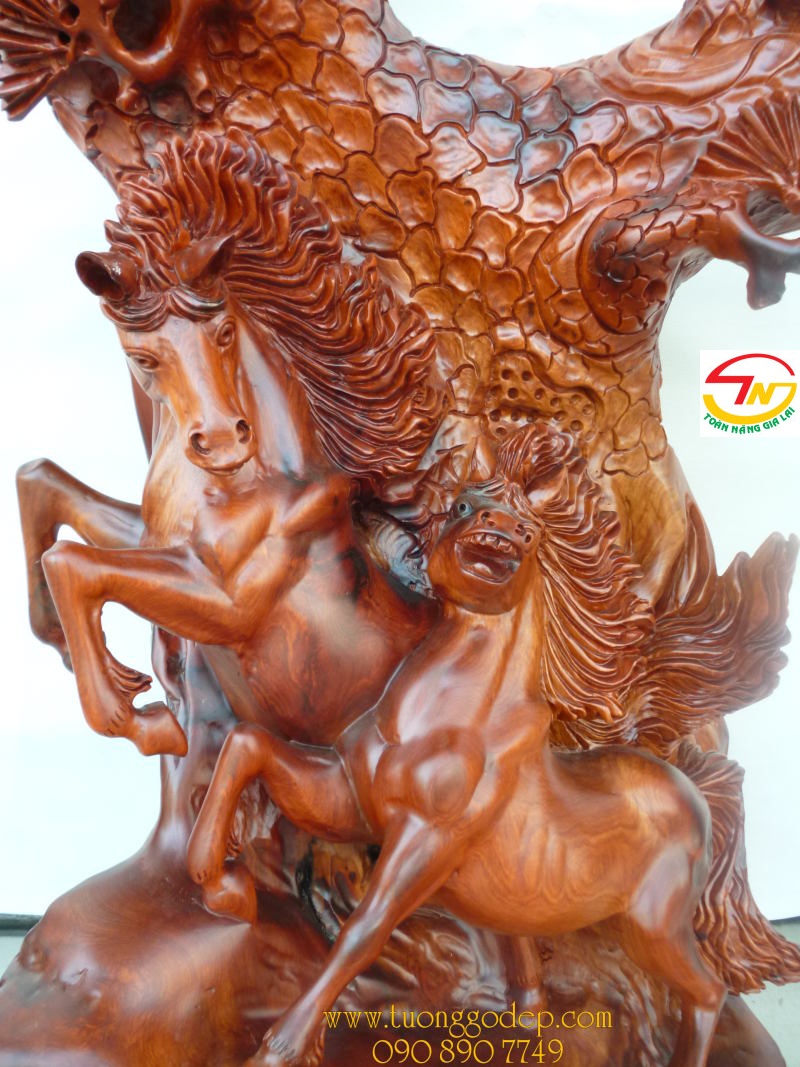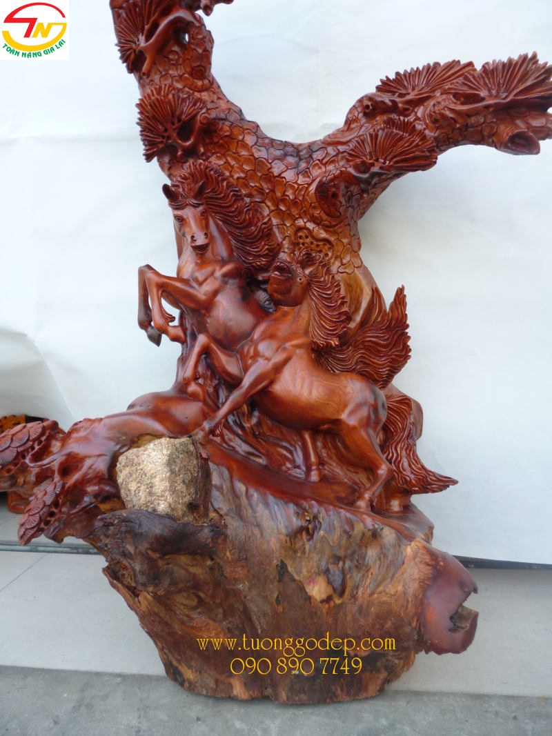 Tượng Song mã truy phong (Gỗ hương ôm đá tự nhiên, cao 1.08m x ngang 80cm)
