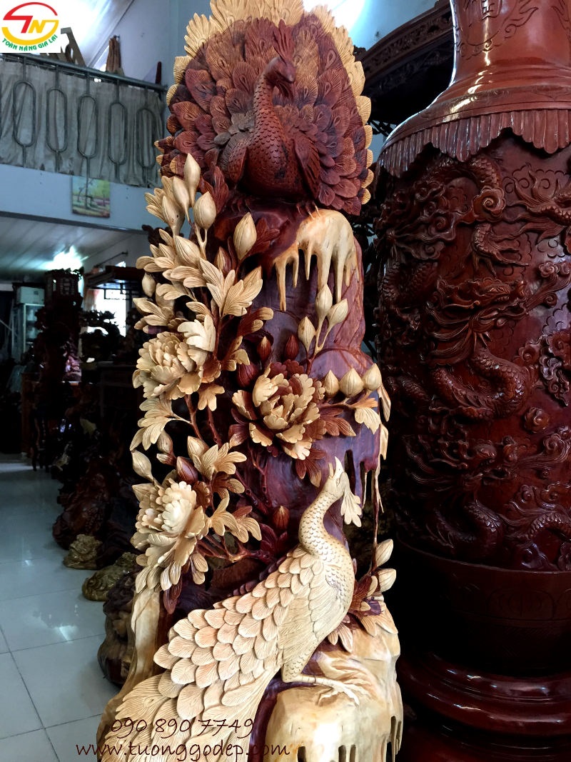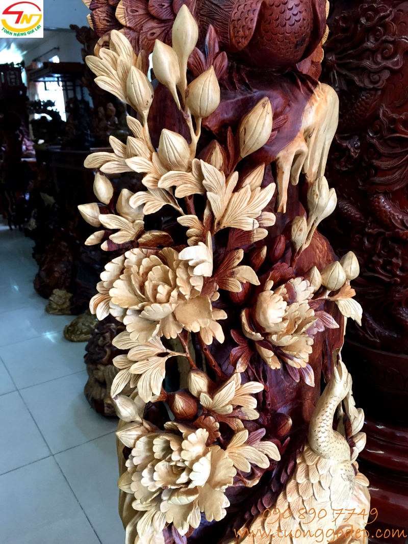 Chim Phượng hoàng được tạc cùng hoa phù dung. Nét đục rất kênh bông