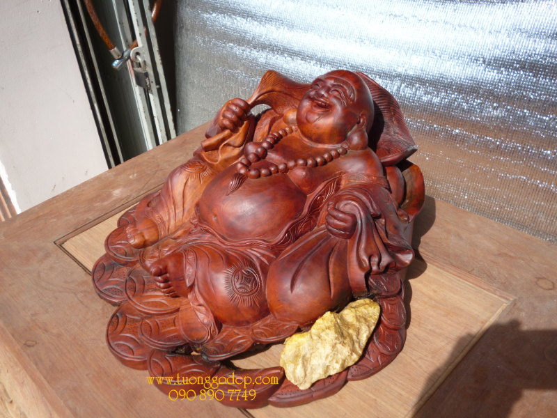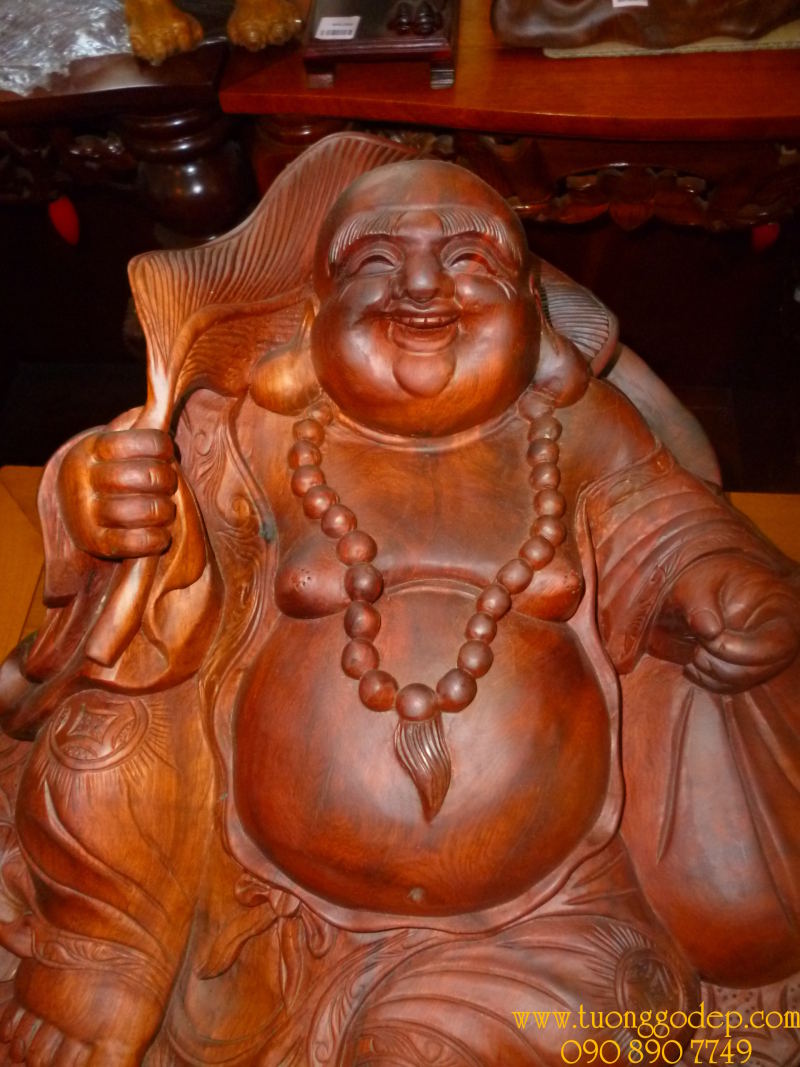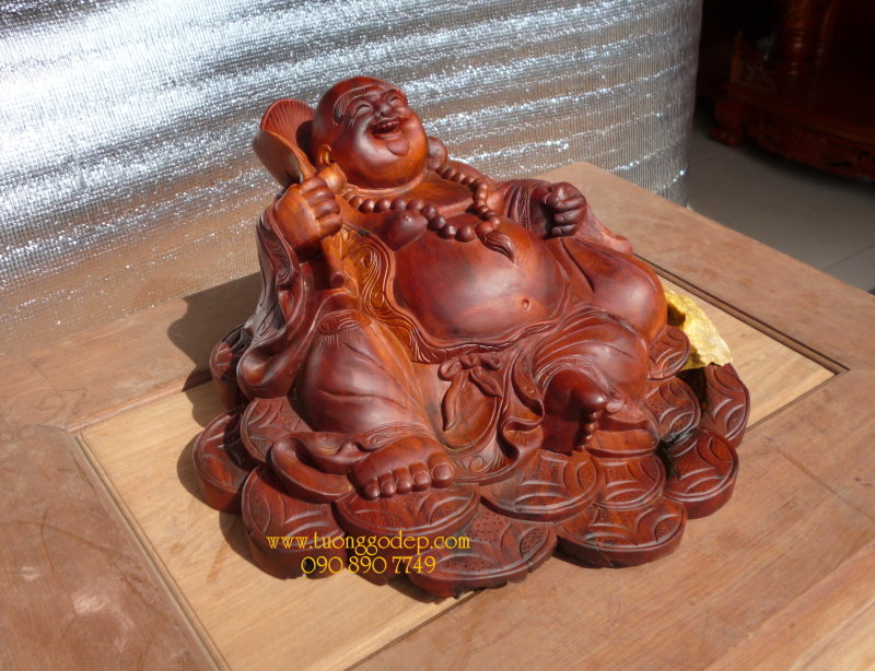 Tượng Phật Di Lặc Quạt ngồi tựa quạt ba tiêu, (Gỗ hương - Ngang 42cm x sâu 42cm, dáng tựa rất thoải mái)