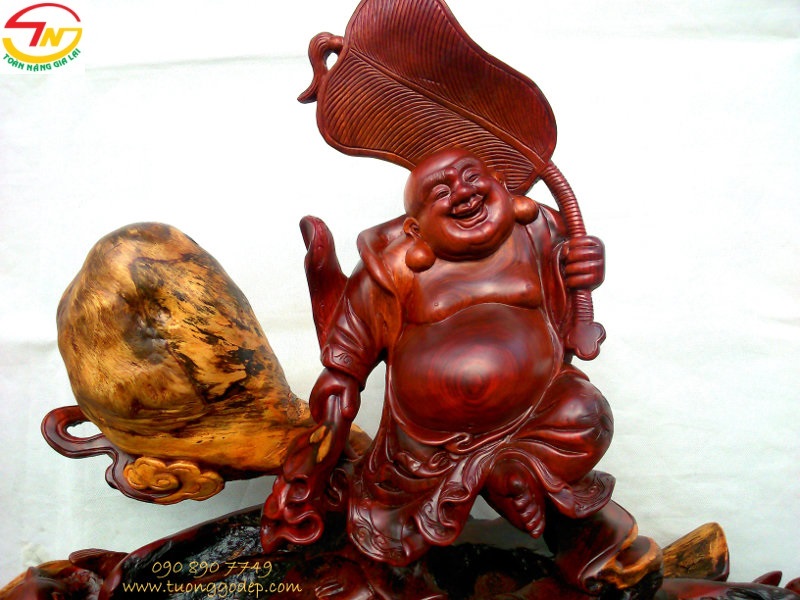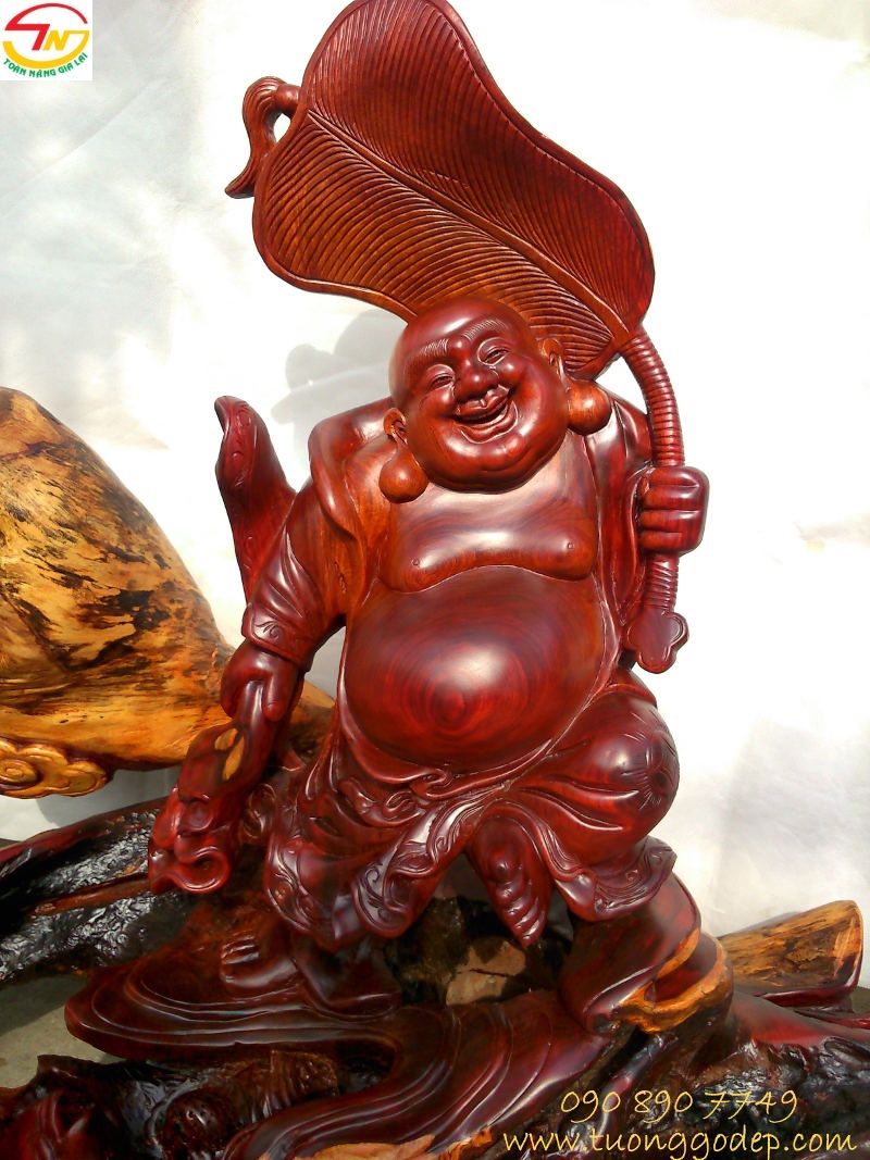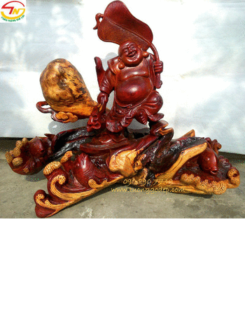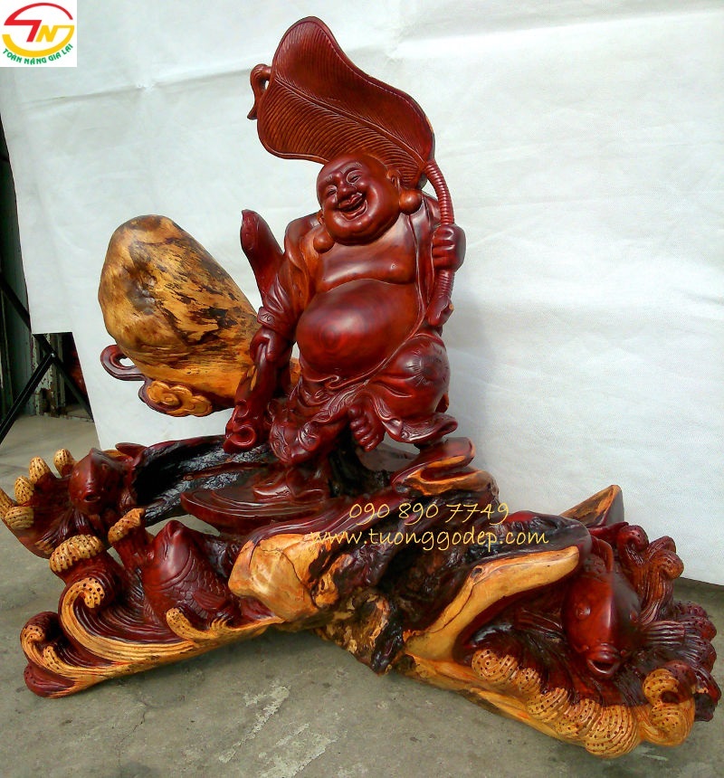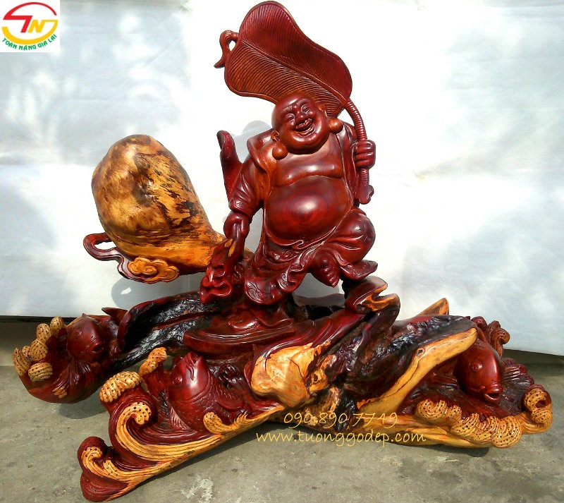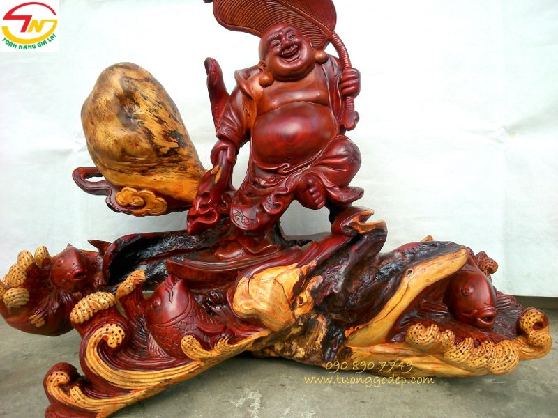Phật Di Lặc đằng vân (bay), bên dưới cá chép - Tay cầm túi càn khôn (Pho tượng được làm theo dáng tự nhiên của gỗ, tâm hồn người thợ và dáng gỗ đã hoà cùng để tạo nên một pho tượng rất nghệ thuật và... Chắc chắn không thể có sản phẩm thứ 2)