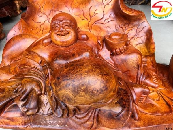 Phật Di Lặc gỗ nu hương ngồi trên như ý lưng tựa lá sen...