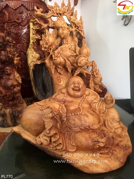 Phật Di Lặc ngồi cây đào tay cầm gậy bát vàng và con dơi mang ý nghĩa Phúc - Tài lộc...
