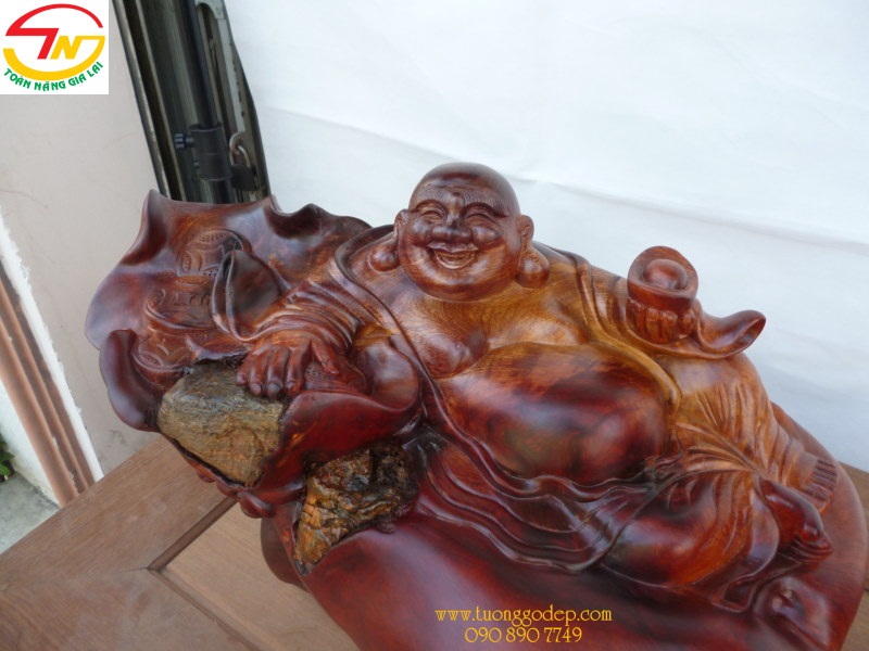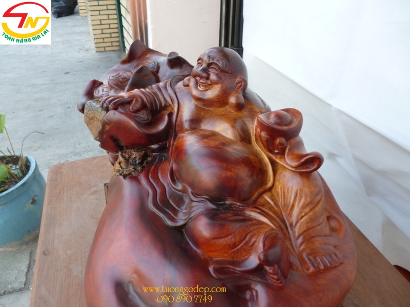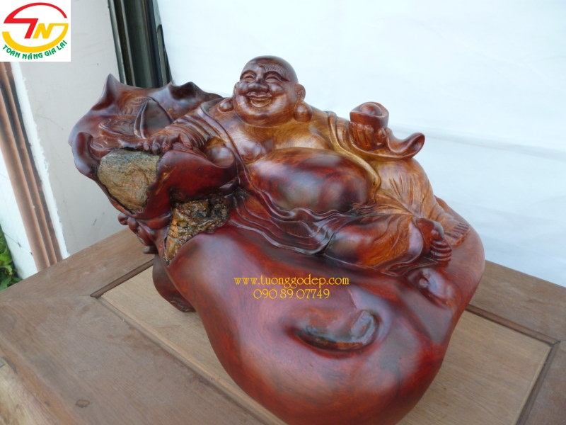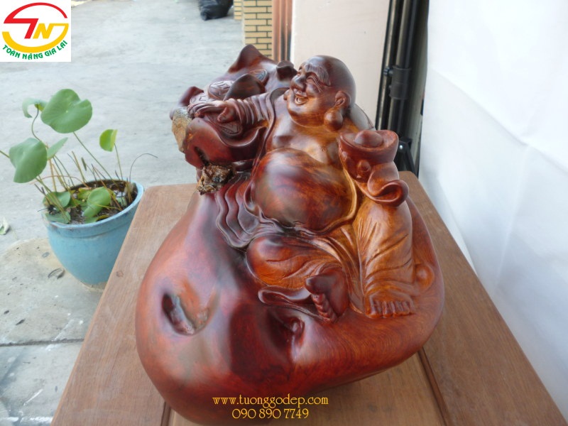 Tượng Phật Di Lặc ngồi bao tiền, tượng gỗ ôm đá, tác phẩm có một không hai (Gỗ hương, ngang 50cm x cao 31cm x sâu 30cm)