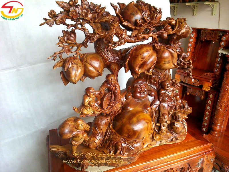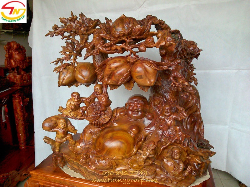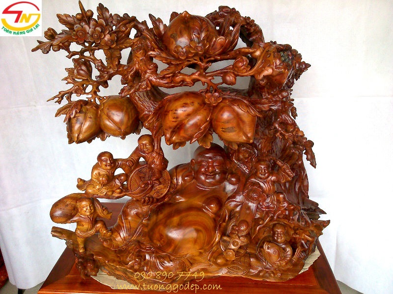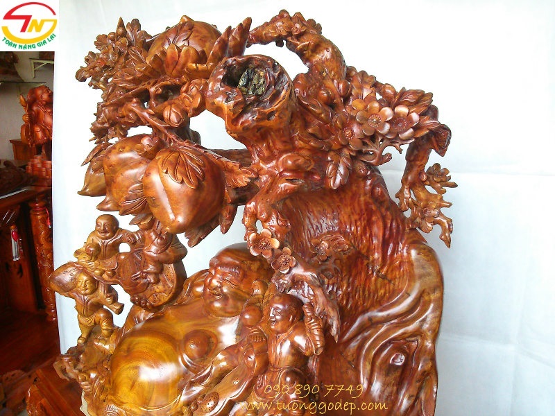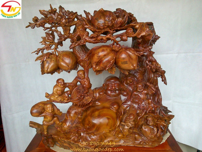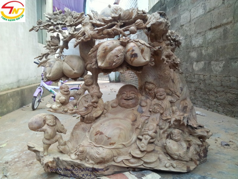 Tượng Di Lặc ngồi gốc đào ngũ phúc (Gỗ xá xị, ngang 1.08m x cao 90cm)